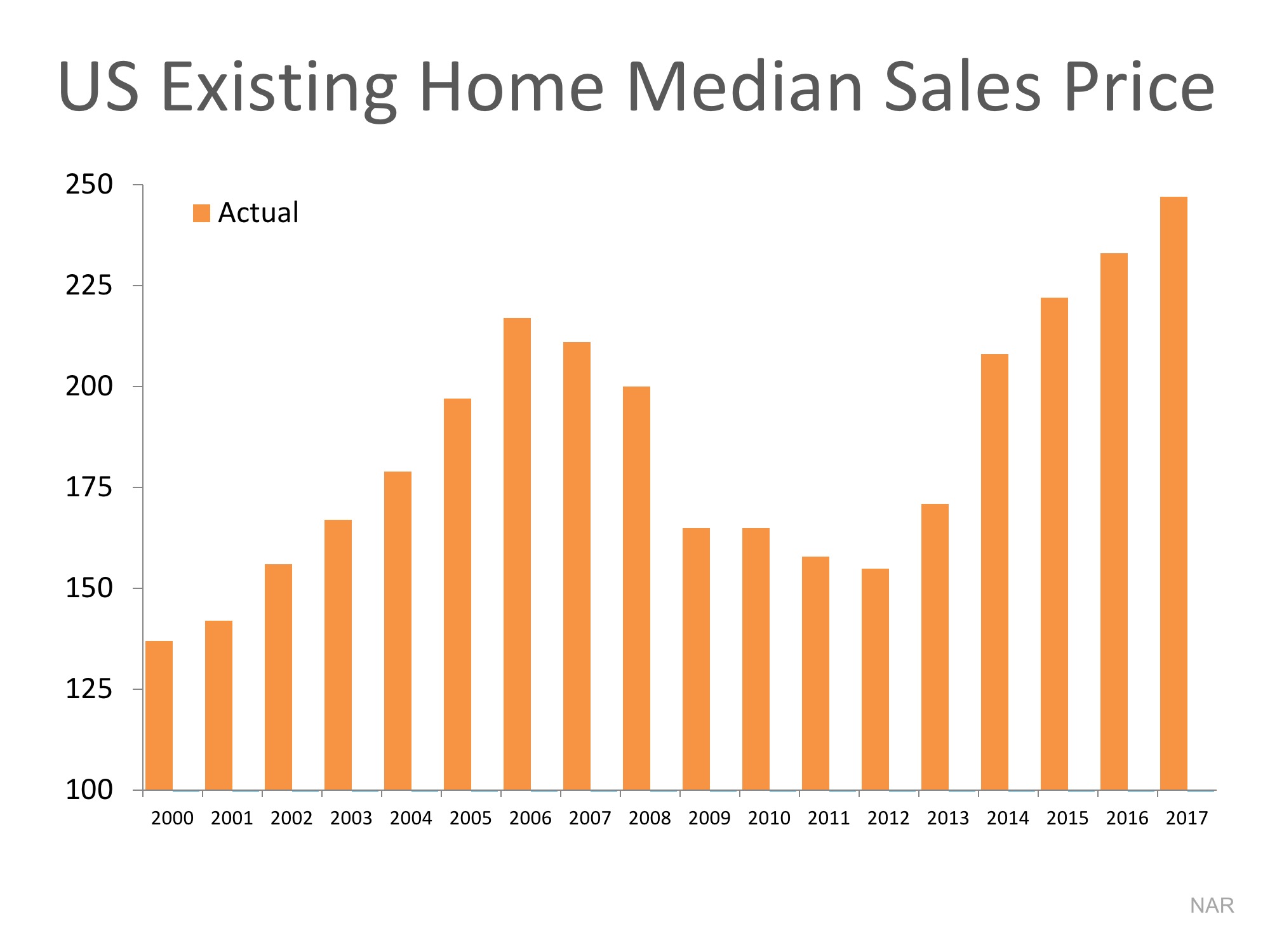 The first graph shows actual median home sales prices from 2000 through 2017.