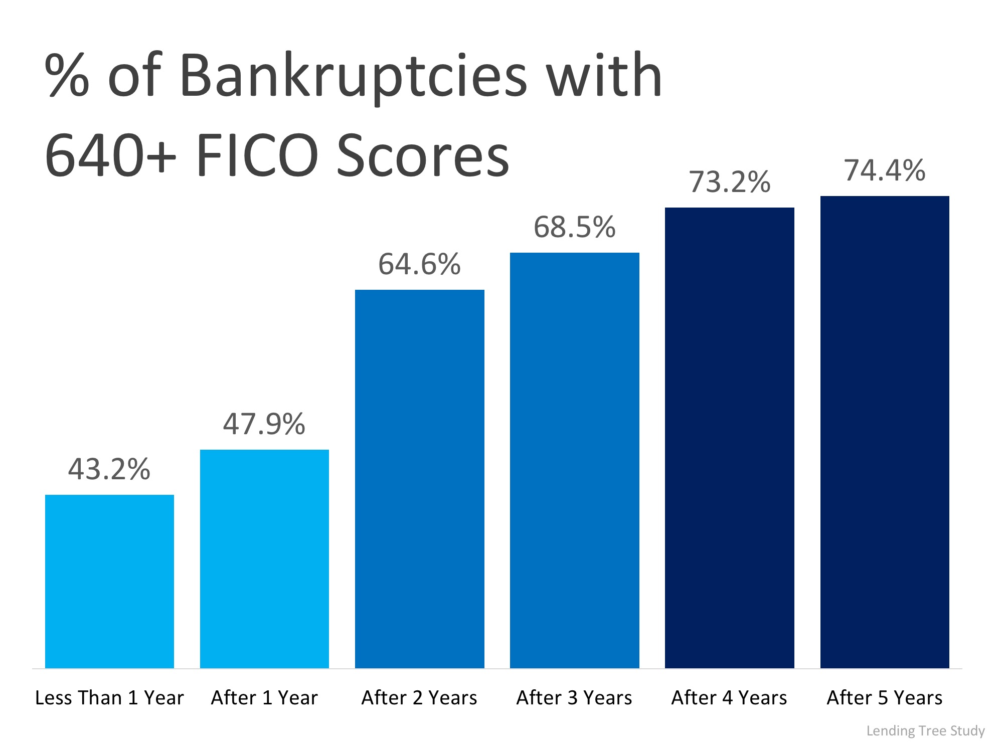 The study found that 43.2% of Americans who filed bankruptcy were able to repair their credit back to a 640 FICO® Score in less than a year. The percentage of those who achieved a 640 FICO® Score increased to nearly 75% after 5 years. The full breakdown of the findings was used to create the chart below.