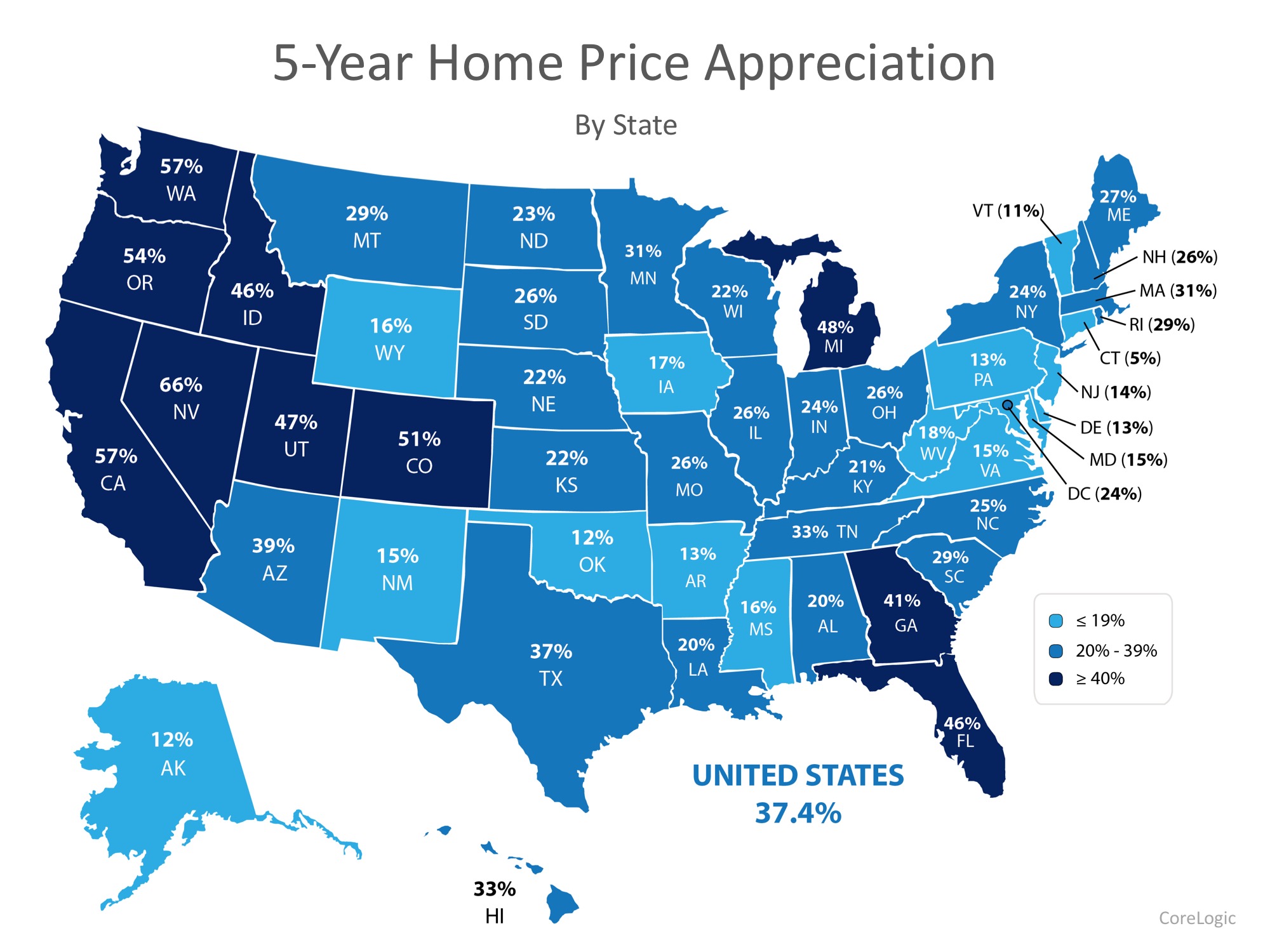 Nationally, the cumulative appreciation over the five-year period was 37.4%, with a high of 66% in Nevada, and a modest increase of 5% in Connecticut.