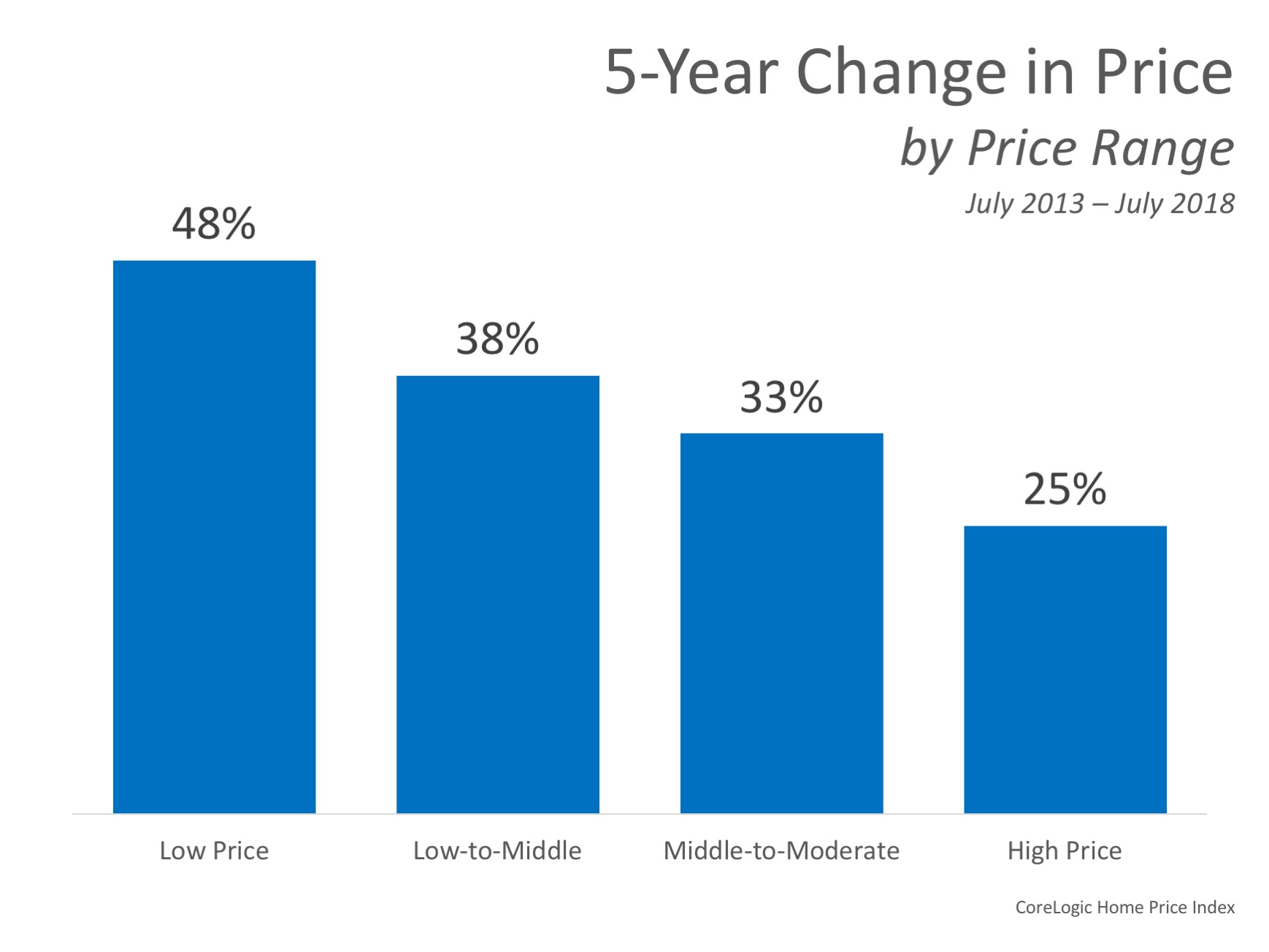 The graph below was created to show the 5-year change in price from July 2013 to July 2018 by price range.