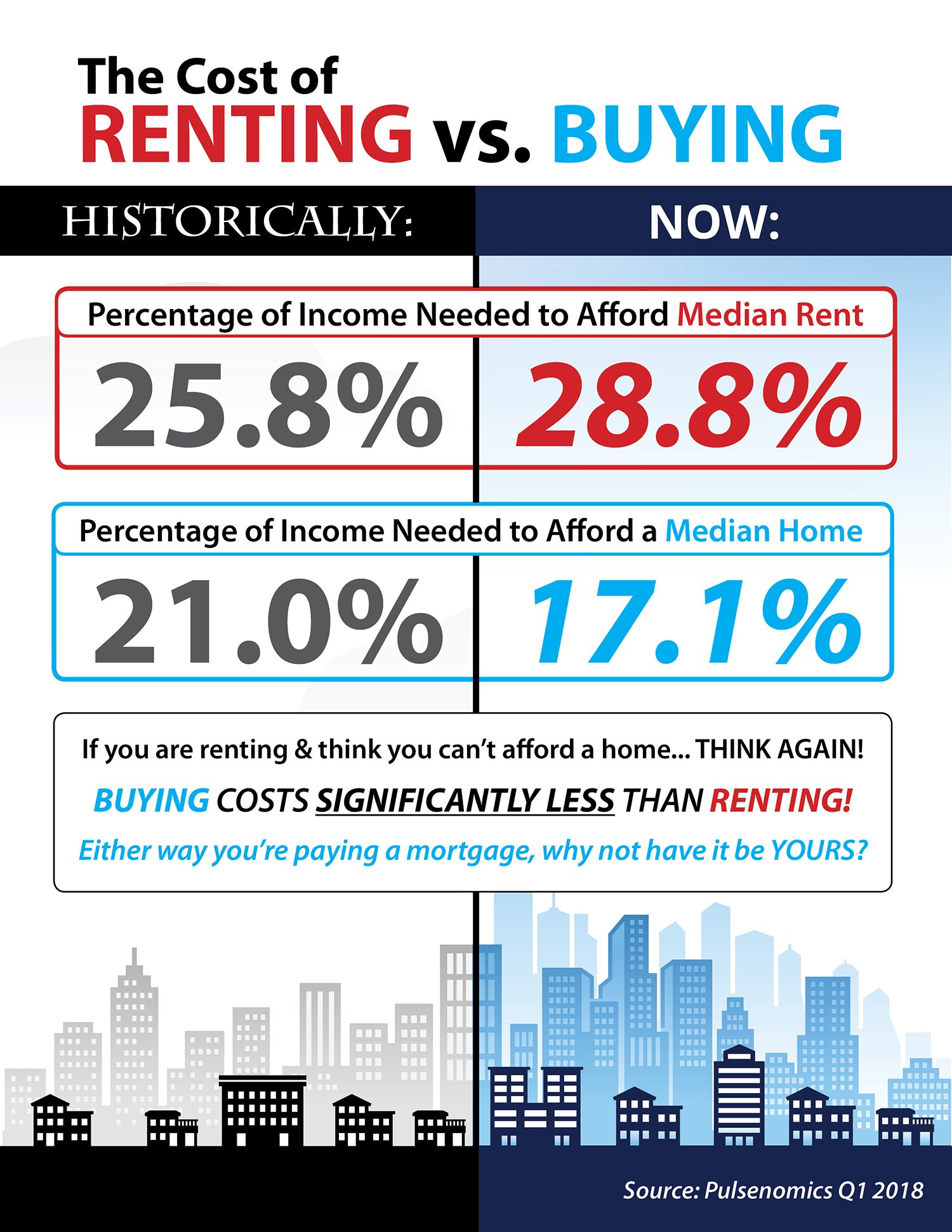 - Looking at the percentage of income needed to rent a median-priced home today (28.8%) vs. the percentage needed to buy a median-priced home (17.1%), the choice becomes obvious.