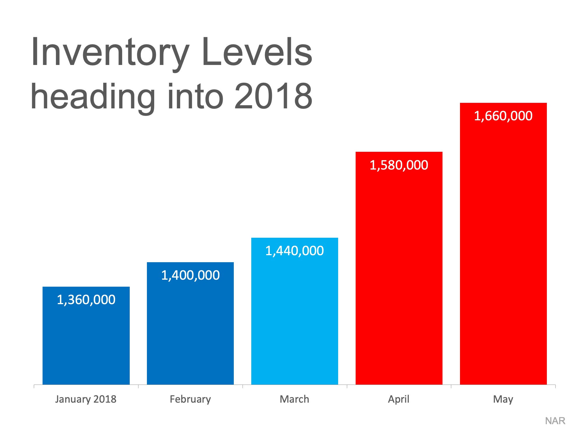 The supply of homes for sale dramatically increases every spring, according to the National Association of Realtors (NAR). As an example, here is what happened to housing inventory at the beginning of 2018: